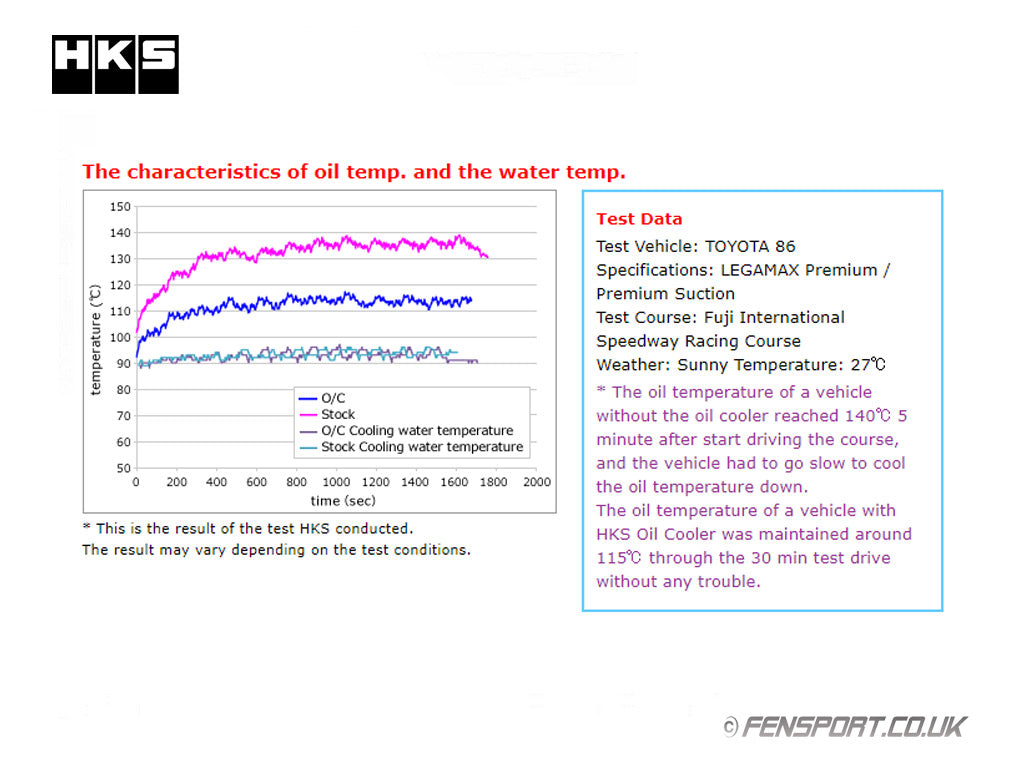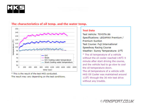 Maintaining a controlled oil temperature is a major factor in engine reliability. The HKS oil cooler kit has been designed and proven to hold oil temperature consistently even on track for 30 minutes!