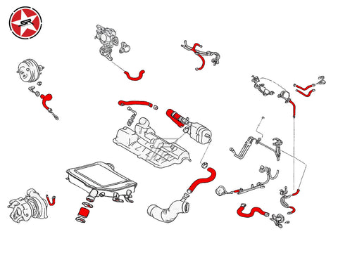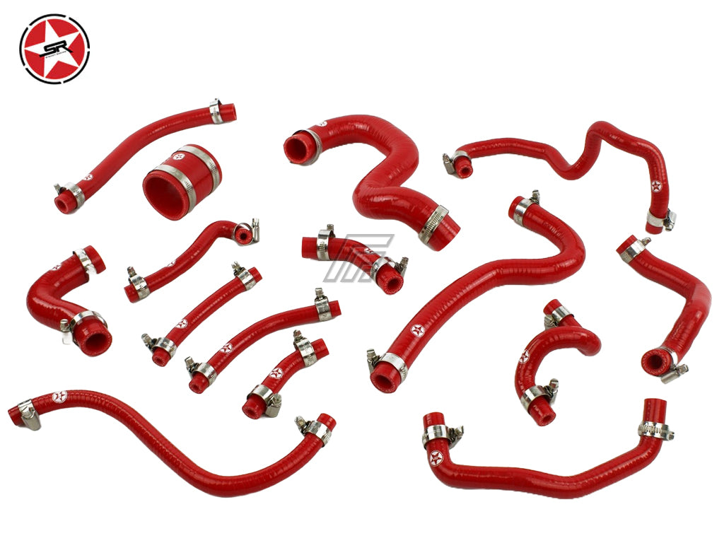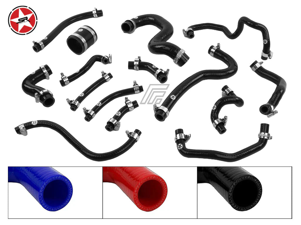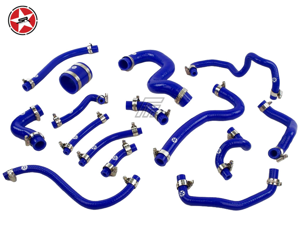 This high quality reinforced silicone hose kit replaces 15 breather and vacuum hoses in the engine bay listed below.